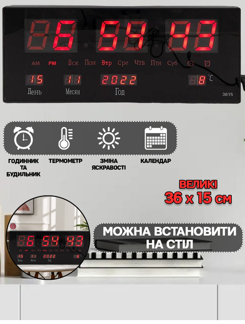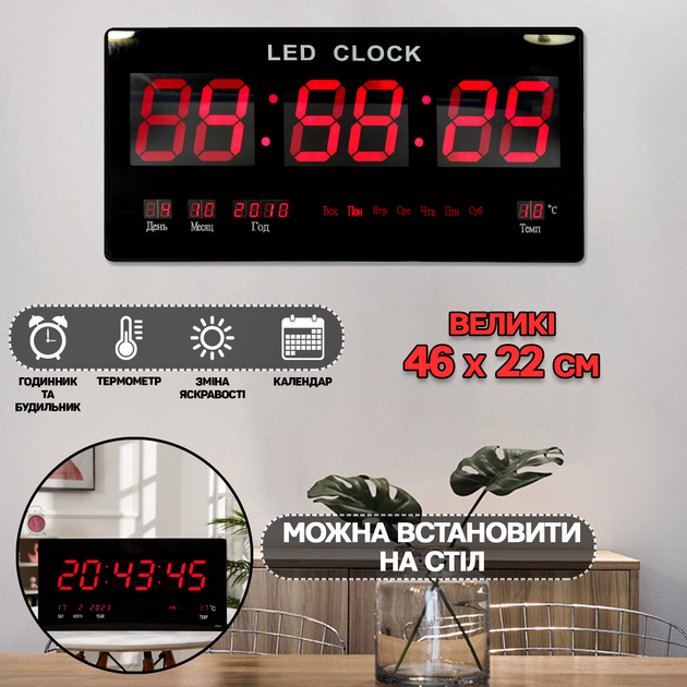 Великий настінний електронний годинник Electric EW4622 з будильником, календарем, термометром, червоне підсвічування