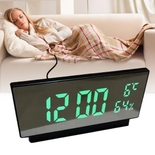 Електронний настільний дзеркальний годинник VST B97Y-4 будильник термометр гігрометр від USB ЮСБ кабелю, Зелений