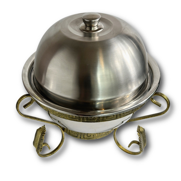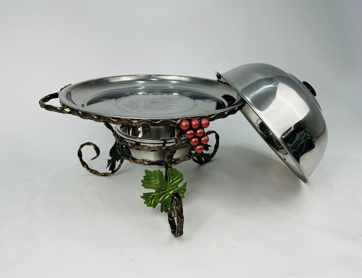 Садж для подачі шашлику з соусницями та чарками VIP 36 см з кришкою з виноградним листям з нержавіючої сталі (125-10-SJ-6570