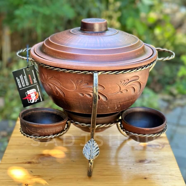 Садж блюдо для подачі шашлика Вітой з глиняним посудом Жаровня 4л з соусницями