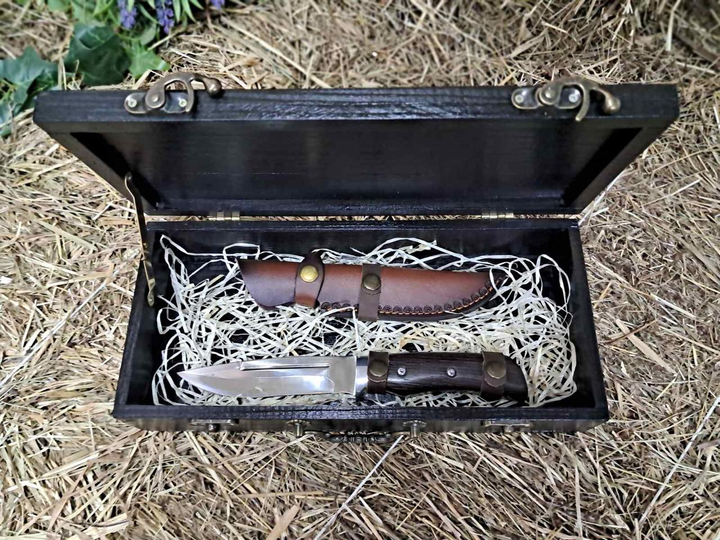 Набір подарунковий, ніж зі шкіряним чохлом в дерев'яному кейсі f-002