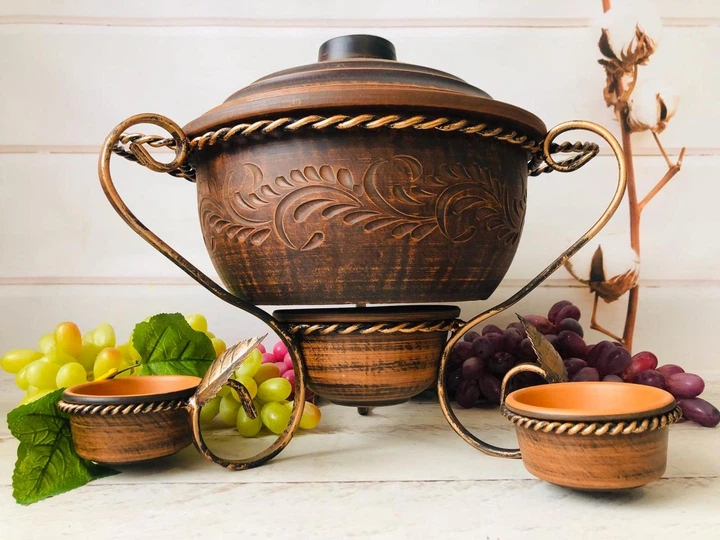 Підставка садж для підігріву м'яса Глинка 5 л з соусницями з глини та сталі коричнева (33-89-5-2)