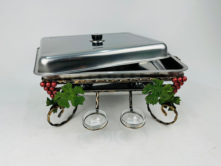 Прямокутний садж для подачі та підігріву шашлику Виноград з кришкою з нержавіючої сталі 45х35 см на підставці зі скляними со