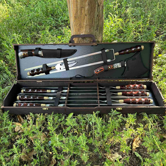 Набір для пікніка з шампурами "Ран" у дерев'яному кейсі з 37 предметів на подарунок куму, брату, свату, чоловікові WC-011