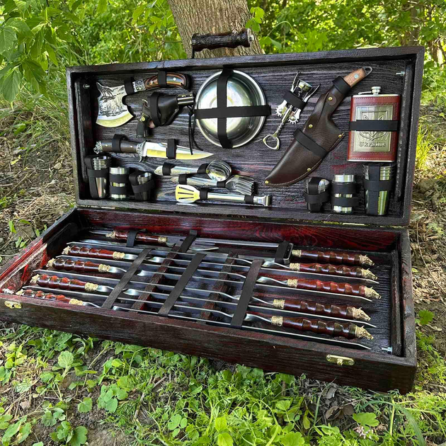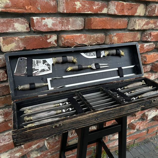 Ексклюзивний подарунковий набір шампурів 6 шт. та аксесуарів BBQ із нержавіючої сталі в дерев'яному кейсі 74х39х14 см ручна