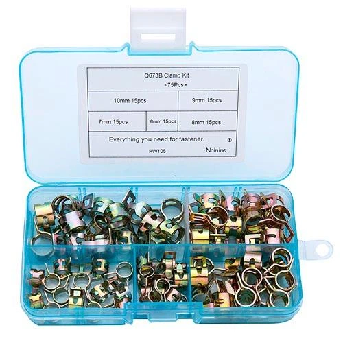 Набір пружинних самозатискних хомутів для шлангів 6-10 мм, 75 шт, оцинкований метал, у пластиковому кейсі