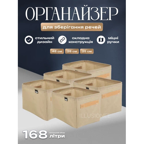 Набір Органайзерів з 5 шт 48 х 28 х 25 см 33 літри для зберігання одягу, білизни, шкарпеток Бежевий 5138725