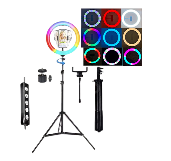 Кільцева кольоровий LED лампа RGB діаметром 26 см, штативом 2 метри і з тримачем для телефону, селфи лампа набір для блогера