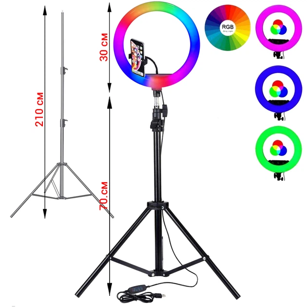 Кільцева лампа зі штативом 2.1 м і власником телефону кільцевої світло для візажистів RGB діаметр 30см різнокольорова