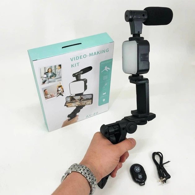 Набір блогера 4в1, тринога для телефону з мікрофоном та спалахом Штатив трипод для селфі та відео
