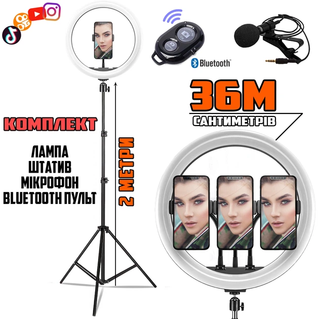 Набір блогера 4в1 Кільцева лампа 36см YS 3200K - 5500K з 3 тримачами телефону світлодіодна + Штатив 2 метри+Мікрофон+Bluetoo
