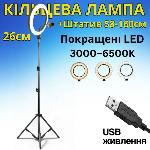 Кільцева Лед Лампа 26 см для візажиста LED лампа з тримачем для телефону зі штативом 2,1 метра та usb пультом