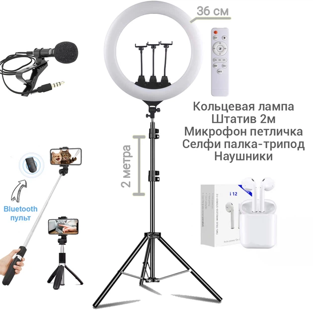 Набір блогера 5 в 1 Кільцева лампа LS360 36см Штатив 2м, мікрофон петличка, селфі-палиця з пультом Bluetooth, навушники