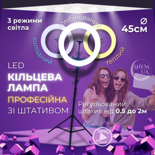 Кільцева лампа для селфі LED 45 см зі штативом 2 м та тримачем для телефону для блогерів, візажистів, фото та відеозйомки, х