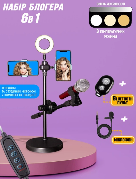Набір Блогера 3 в 1: Гнучкий тримач для телефону на прищіпці з кільцевої LED лампою, Bluetooth пульт, мікрофон петличка