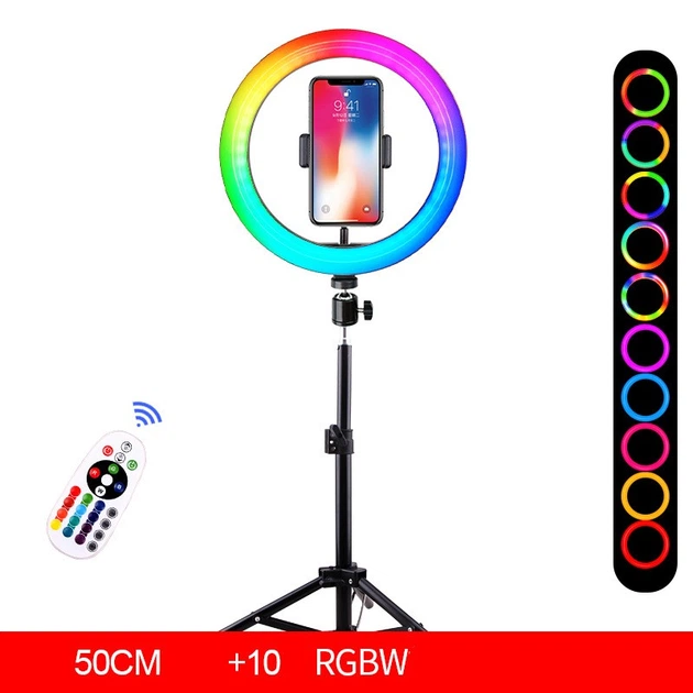 Кільцева лампа RGB 26 см із штативом 210 см, Кольорова лампа для селфі, Кільцева лампа з тримачем до телефона