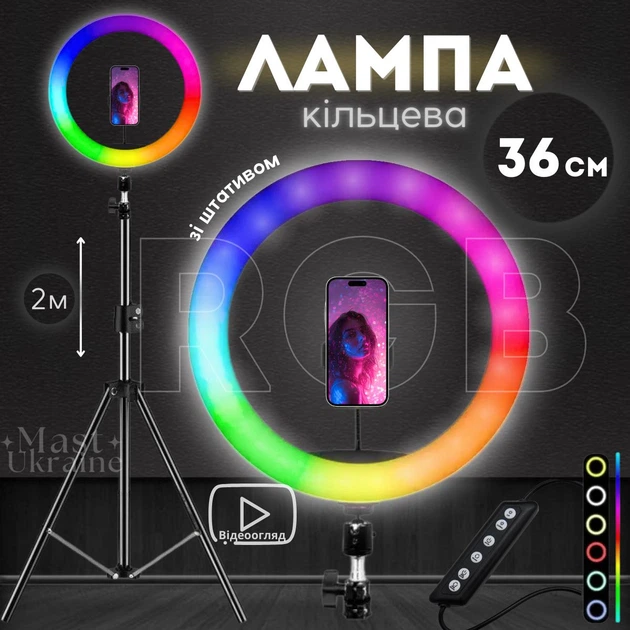 Світлодіодна кільцева лампа RGB LED 36 см для селфі, зі штативом та тримачем для телефона, лампа для блогера MJ36T