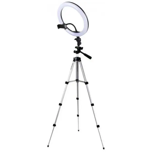 кільцева лампа, Призначення - для смартфона, Комплектація - кільцева LED лампа, тримач телефону, штатив-трипод, пульт ДУ, Тип установки - настільний, підлоговий, Зовнішній діаметр лампи - 300 мм, холодний, теплий, нейтральний, Висота в зібраному стані - 49.5 см, Висота в розкладеному стані - 110 см, 1600 г, чорний