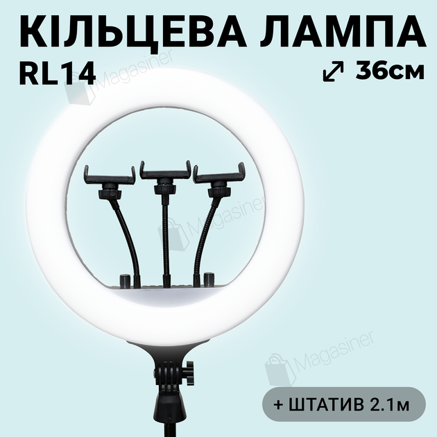 Професійна кільцева лампа RL 14 36 см зі штативом на 2.1 метр і тримачами для телефону (2422-1)