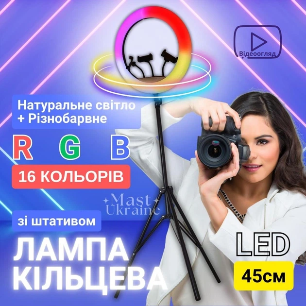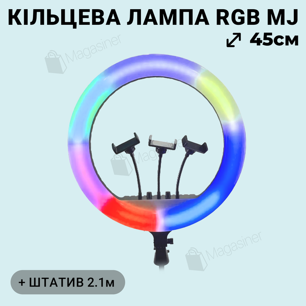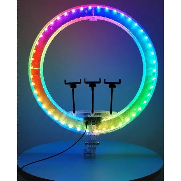 Кільцева лампа RGB LED 45 см для селфі зі штативом та тримачем на 3 телефони, лампа для фото та відеозйомок, блогерів, TikTo