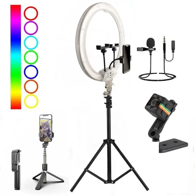 Набір блогера 5в1 Світлодіодна кільцева RGB лампа 3D 45см Штатив 2м Селфі палиця Петличний мікрофон Екш камера
