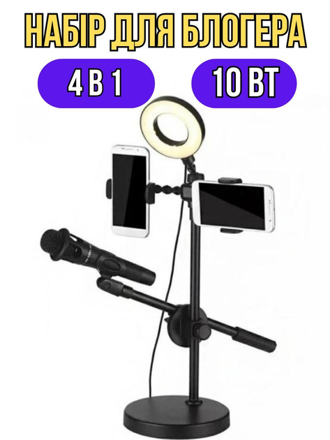 Набір для блогера 4 в 1 Кільцева лампа з тримачем для мікрофона і двома тримачами для телефону, LED світло для блогерів, USB