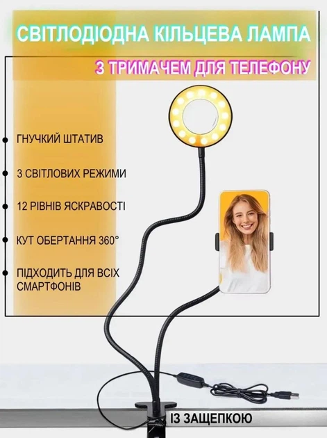 Кільцева лампа на прищіпці LiSt5504 для селфі з гнучким штативом та тримачем для смартфона 3 режими
