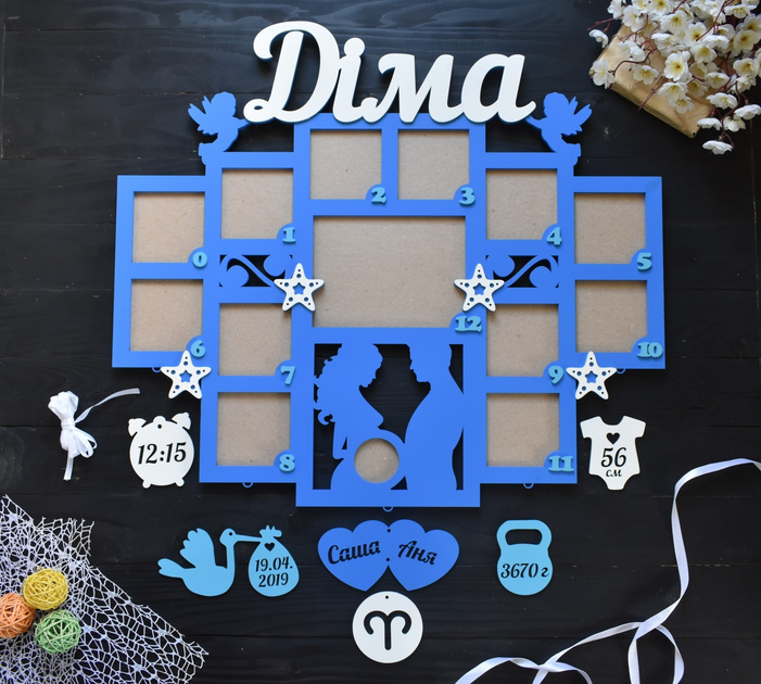 Дитяча фоторамка метрика на перший рік із парою для знімка УЗД "Діма" на замовлення (ДГ0108)