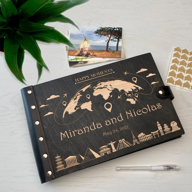 Фотоальбом з дерева та гравіюванням Земна куля А4 формата та колір чорний