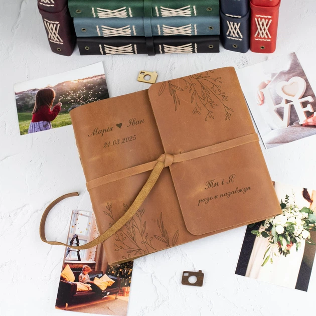 Фотоальбом шкіряний з гравіюванням на замовлення, 40 аркушів слонова кістка, Whisky, Malina Leather