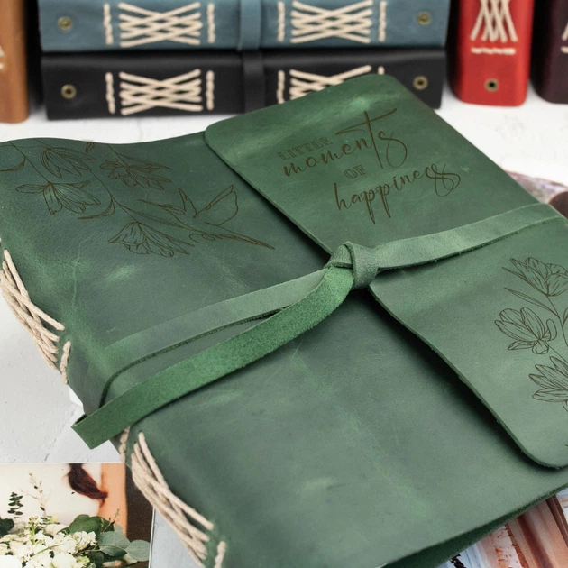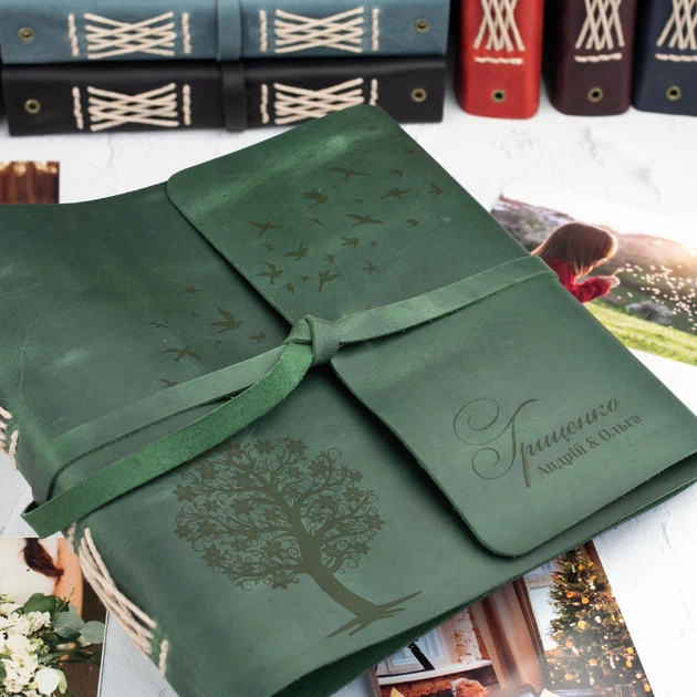 Фотоальбом шкіряний з гравіюванням на замовлення, 40 аркушів крафт, Green, Malina Leather
