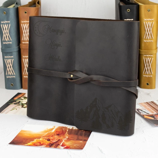 Шкіряний фотоальбом з гравіюванням Мандруй. Цінуй. Живи., 40 аркушів крафт, Black, Malina Leather