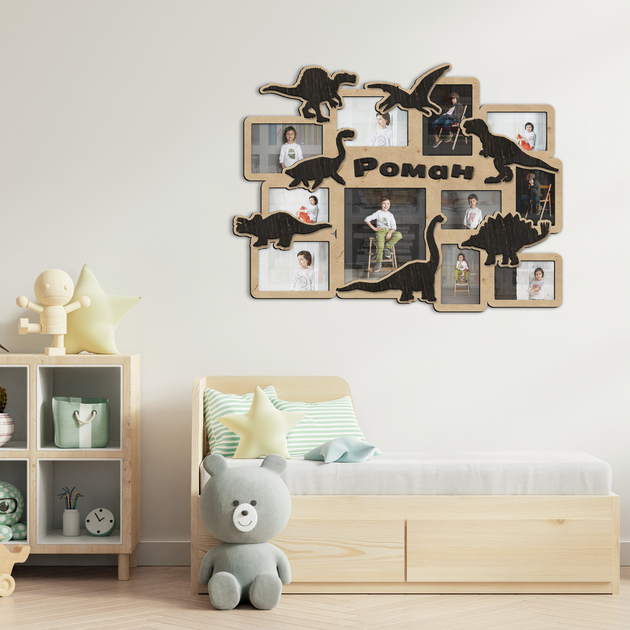 Настінна фоторамка з дерева на 11 фото з динозаврами та ім'ям дитини 79х59 см від The Frame Depot (dinocollage)