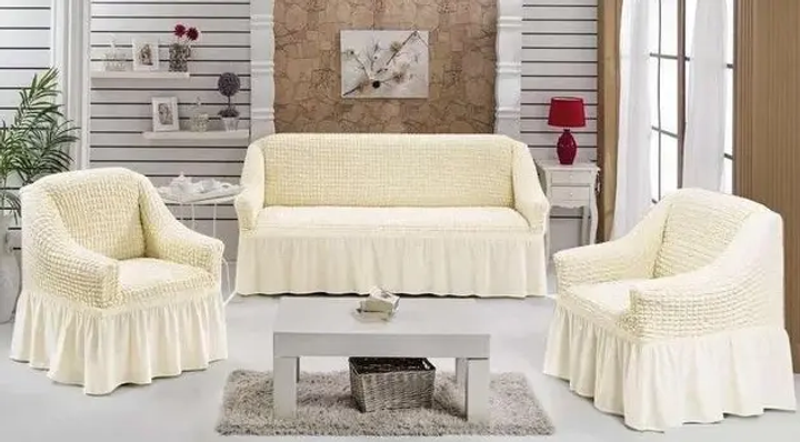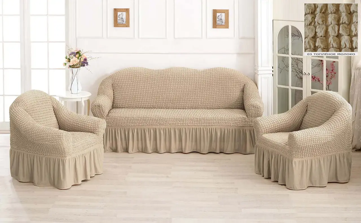 Натяжний чохол на диван та два крісла Туреччина, універсальний чохол, накидка на диван, кремовий