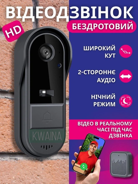 Розумний дверний дзвінок з камерою нічного бачення бездротовий Wi-Fi відеодзвінок з функцією домофону, огляд 170 °, чорний