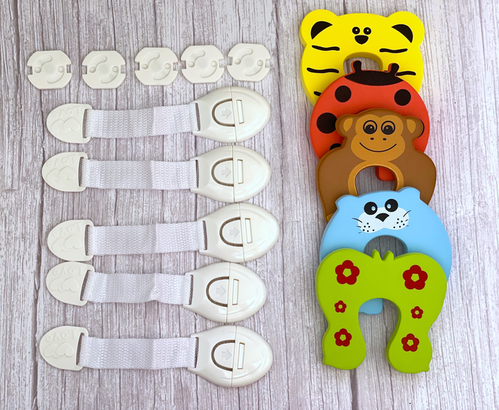 Набір дитячого захисту 13 предметів, 5 білих тканинних замків + 5 блокатори-стопори (обмежувачі дверей) + 5 заглушок для роз