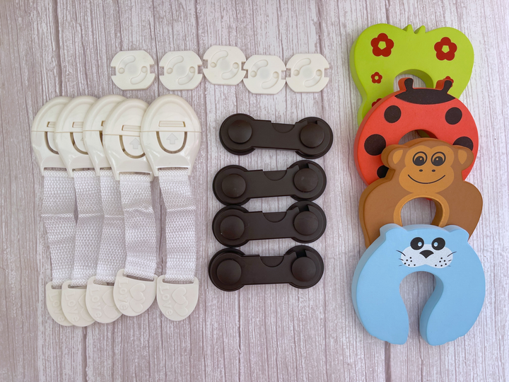 Набір дитячого захисту 18 предметів: білі тканинні замки, блокатор-стопор (обмежувач дверей), заглушки для розеток, замки-га
