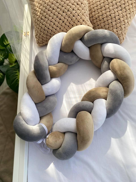 Бампер-коса захист у дитяче ліжечко темний беж-сіро-білий 3-плетіння 100 см