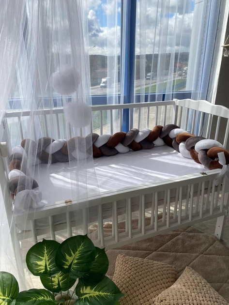 Бампер-коса захист у дитяче ліжечко сіро-біло-коричневий 3-плетіння 100 см