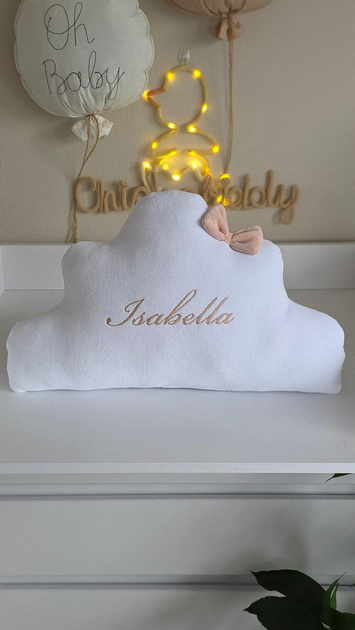 Декоративна подушка з вишивкою імені, Хмаринка з пудровим бантиком, бортик в ліжечко, білосніжний велюр, реквізит на фотосес