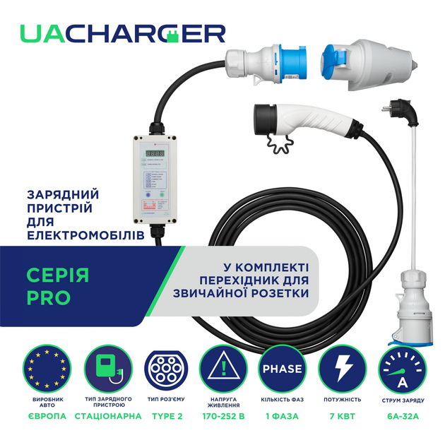 Зарядний пристрій UACHARGER PRO для електромобілів Tesla, 7,0 кВт, 6A-32А, 230В.
