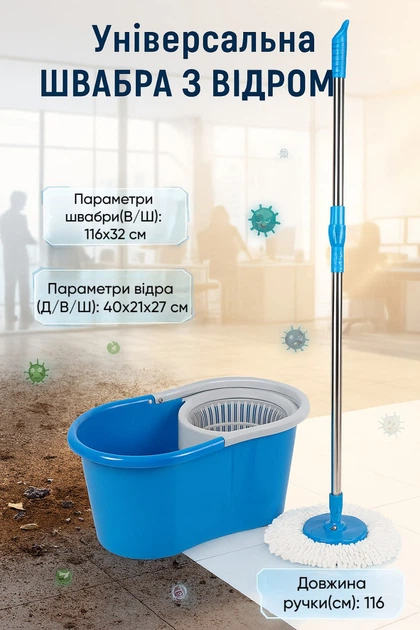 Швабра з відсіком на 7л + 1 насадка / Швабра і відро з віджимом / Набір відро і швабра