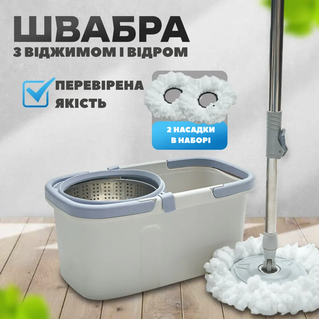 Комплект для прибирання швабра з відром на 6л з віджиманням центрифугою та полосканням та телескопічною ручкою і 2 насадками