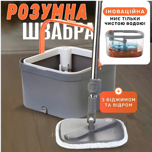 Комплект для прибирання Розумна швабра з безконтактним віджиманням і відром + 2 насадки, компактна для всіх типів підлоги пр