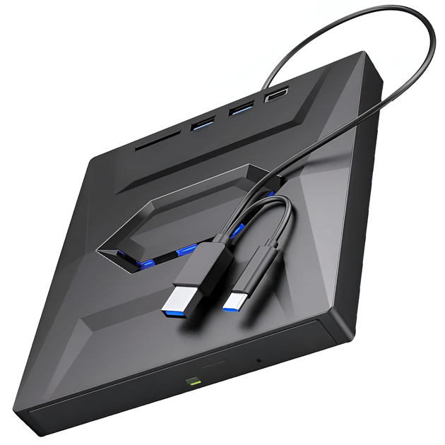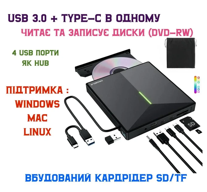 Зовнішній CD/DVD-привід ORIGBELIE — USB 3.0 + Type-C, запис/читання дисків, кардрідер SD/TF