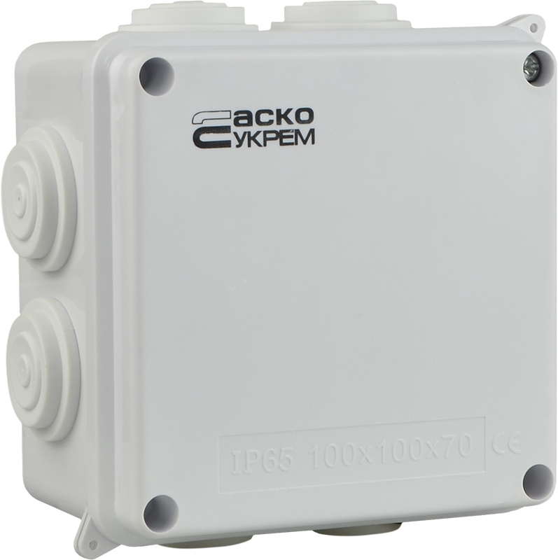 Розподільна коробка з кришкою, розміром 107х107х50 мм. Має велику кількість входів для вставки кабелів та труб.