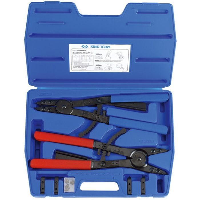 Укомплектований популярними щипцями для зовнішніх і внутрішніх стопорних кілець. Приваблива упаковка для системи самообслуговування, з отвором під гачок. Міцна пластмасова упаковка; також призначена для подальшого зберігання щипців. 8 предметів