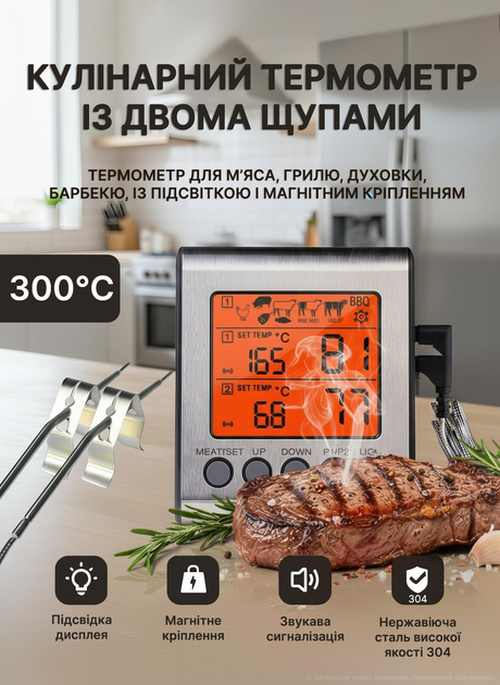 Кулінарний Термометр Електронний з Двома Щупами (300°C) TermoProfi-YZ6031-MR Для М'яса Гриля Духовки З LED-підсвічуванням та