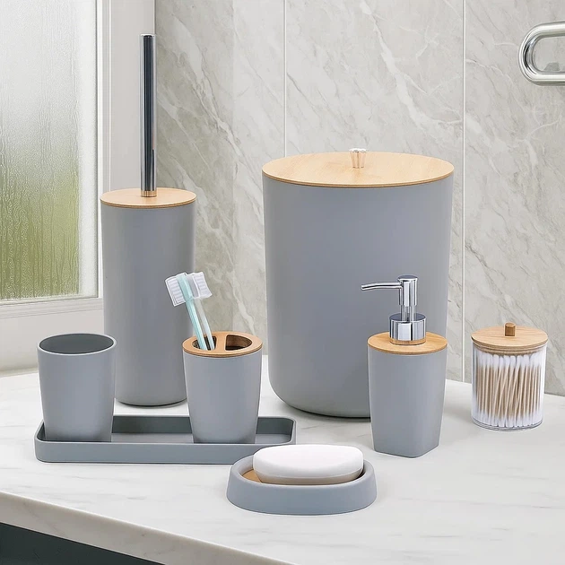 Набір аксесуарів для ванної кімнати і душа 8в1, відро, дозатор для мила, мильниця,склянки та аксесуари, сірий T236-8gray