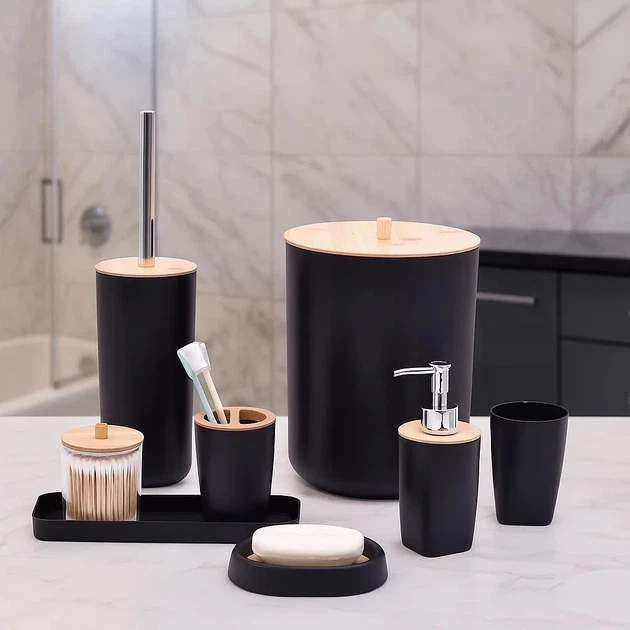 Набір аксесуарів для ванної кімнати і душа 8в1, відро, дозатор для мила, мильниця, склянки та аксесуари, чорний T236-8black